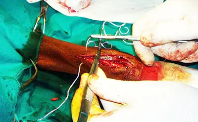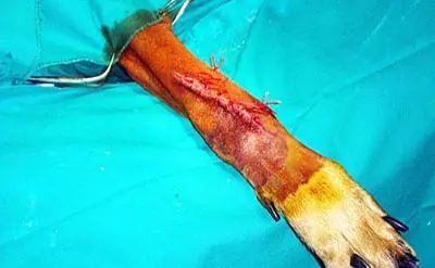Фреза извлекается, костные полуцилиндры вынимаются стоматологическим элеватором. Трансплантируемый цилиндр вставляется в подготовленное ложе и плотно забивается заколоткой. Уже эта костная пробка фиксируеткости в приданом положении. Дополнительно для избежания последующего смещения при пользовании конечностью через кости запястья и цилиндр проводятся две скрещивающиеся спицы Киршнера. Обязательно накладывается прочная гипсовая лонгета, которую сохраняют до рентгенологически подтвержденной костной консолидации, то есть на 1,5-2 месяца. В течение всего этого времени собака может вполне уверенно пользоваться оперированной конечностью. Спицы можно извлечь в отдаленном периоде, либо они выходят самостоятельно.
